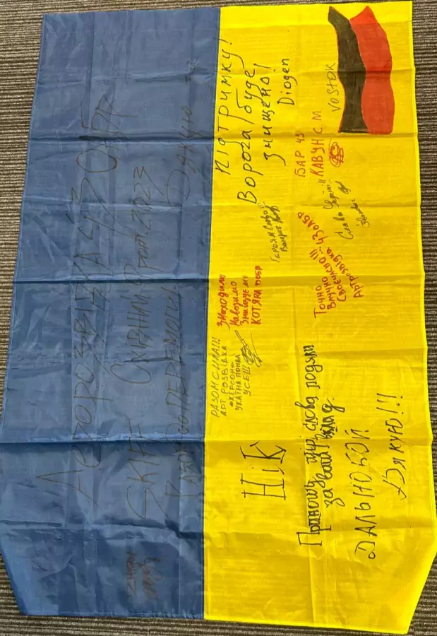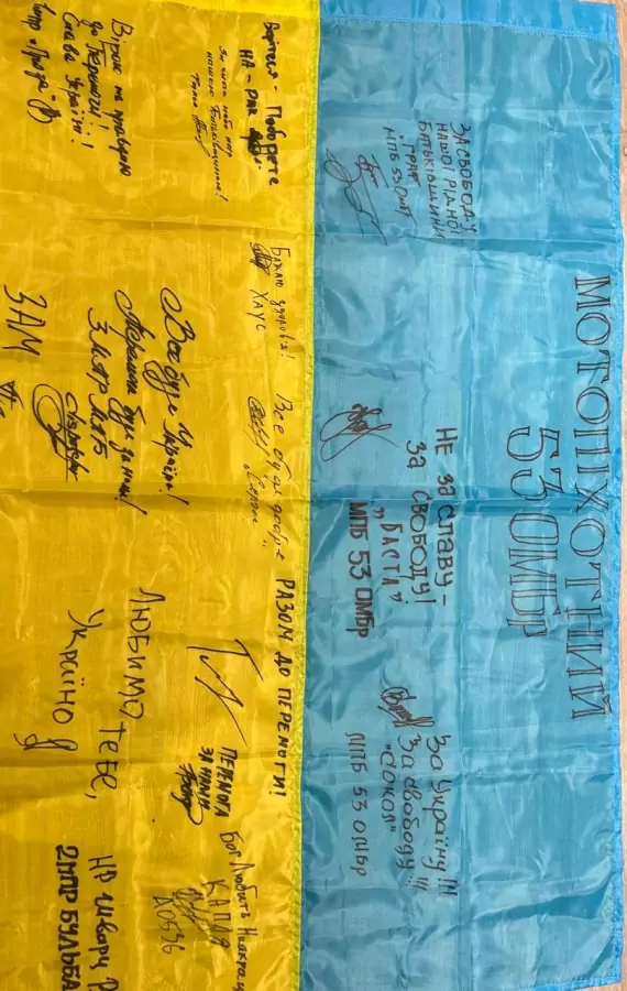 Прапор з підписами хлопців (надсилаємо поштою) Прапор з підписами хлопців (надсилаємо поштою) Прапор 53-ї Бригади Прапор 43-ї Артилерійської Бригади Прапор 3-ї Окремої Штурмової Бригади Прапор 53-ї Бригади Можливі варіанти Прапор 43-ї Артилерійської Бригади 200$+ Замовити Прапор інженерно-cаперної роти 120 Бригади 250$+ Замовити Прапор 3-ї Окремої Штурмової Бригади 300$+ Замовити Прапор 53-ї Бригади 350$+ Замовити